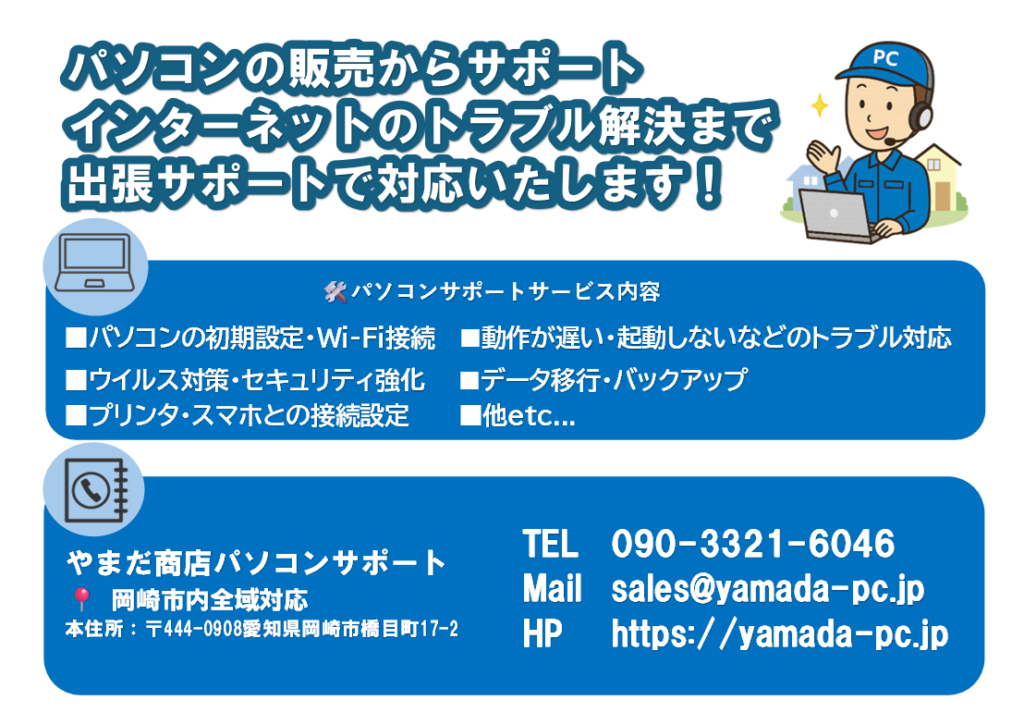 | パソコンセットアップ費用 | 1台¥22,000- | セットアップからアップデート、出張取付費まで含まれております。 お客様がすでにご購入されたパソコンでも対応致します。 |